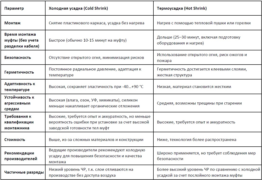 Исследования и практический опыт показывают, что холодная усадка обеспечивает более стабильную герметичность и защиту кабеля на протяжении всего срока эксплуатации (до 30 лет и более). Материал сохраняет эластичность, не трескается и не теряет свойства под воздействием УФ, озона и химических веществ.